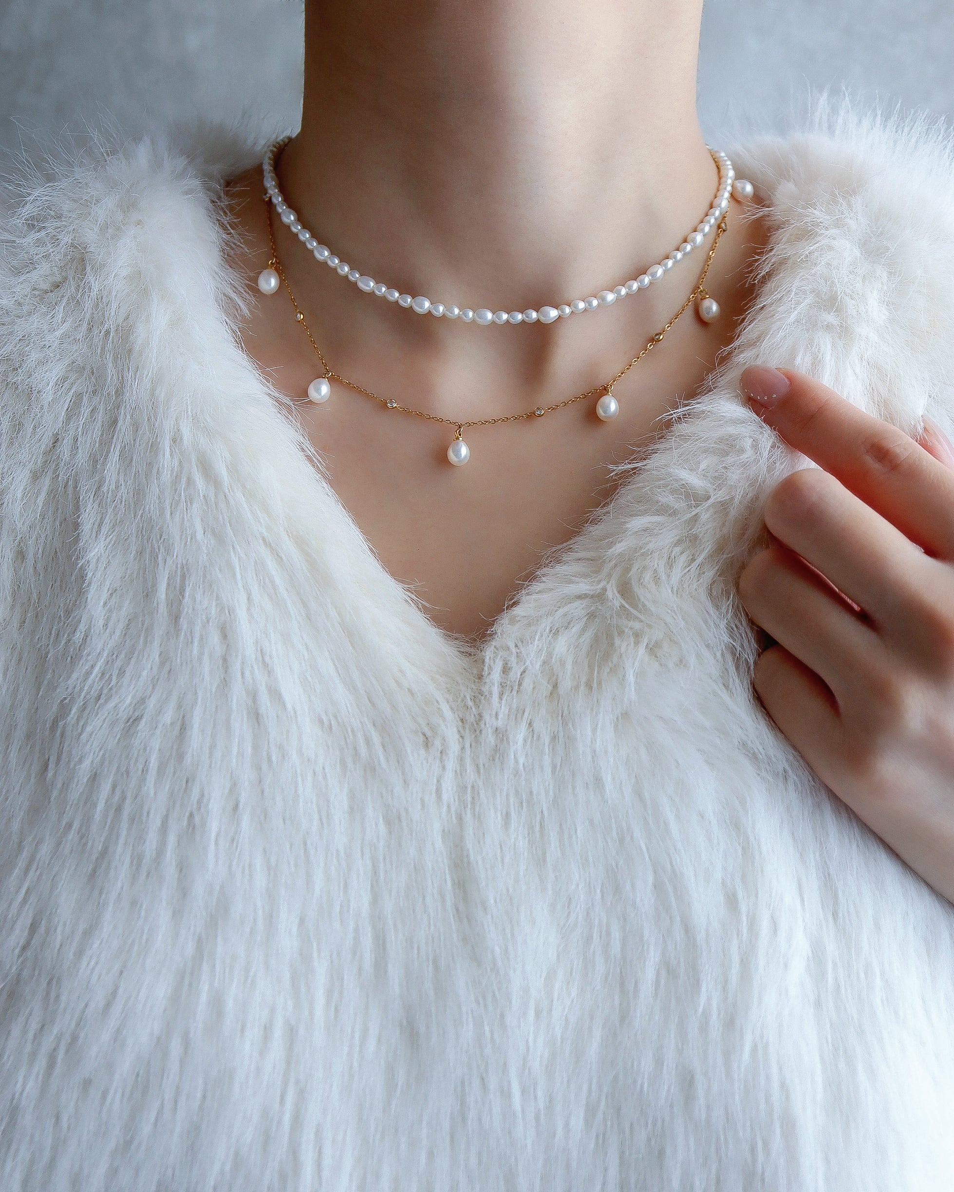 ベビーパールとステーションネックレスのレイヤードは感度の高さを印象付けてくれます。