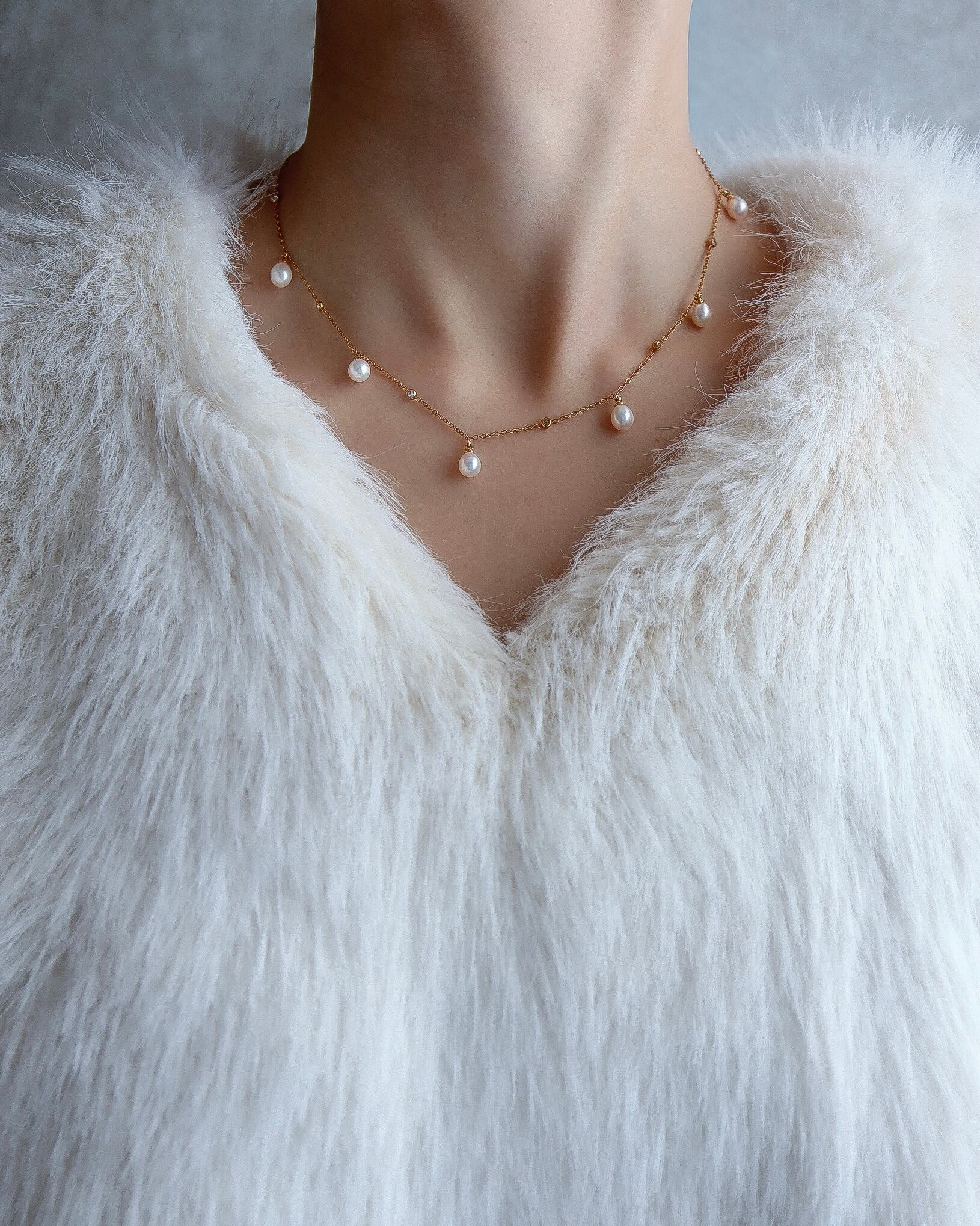 ドロップパールが首元の縦のラインを美しく魅せるステーションネックレス。