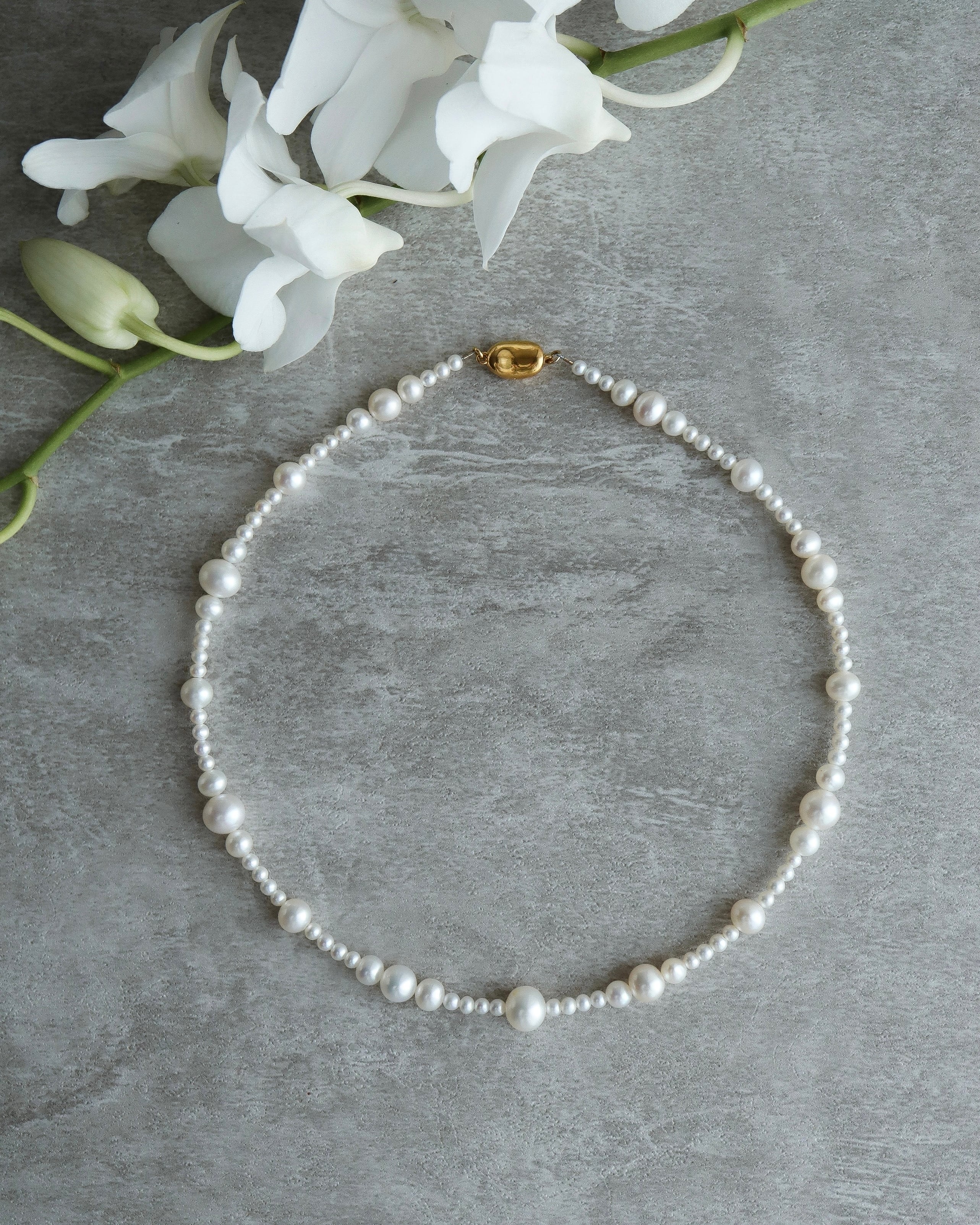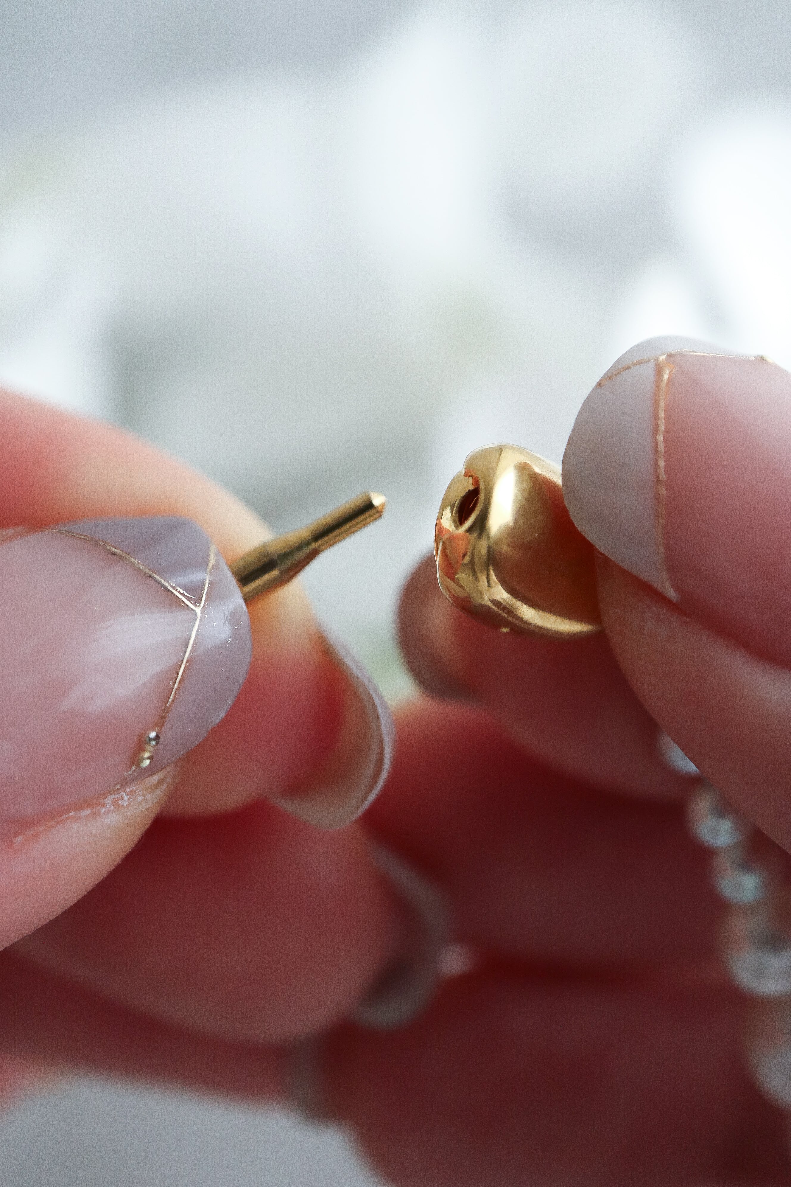 留め具は、さりげない美しさと機能性を兼ね備えた、ビーンズクラスプ。